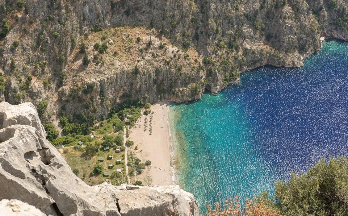 Surrounded by 350 meters of cliffs, Butterfly Valley is located in Fethiye - Oludeniz region. Those who want to come here can only access it by sea because the valley is surrounded by high cliffs. But once you come from the sea, you can climb the mountain with a rope. There is no place to stay in the valley, there are treehouses and tents for visitors. It is possible to come back or stay after enjoying the sea by a daily boat.